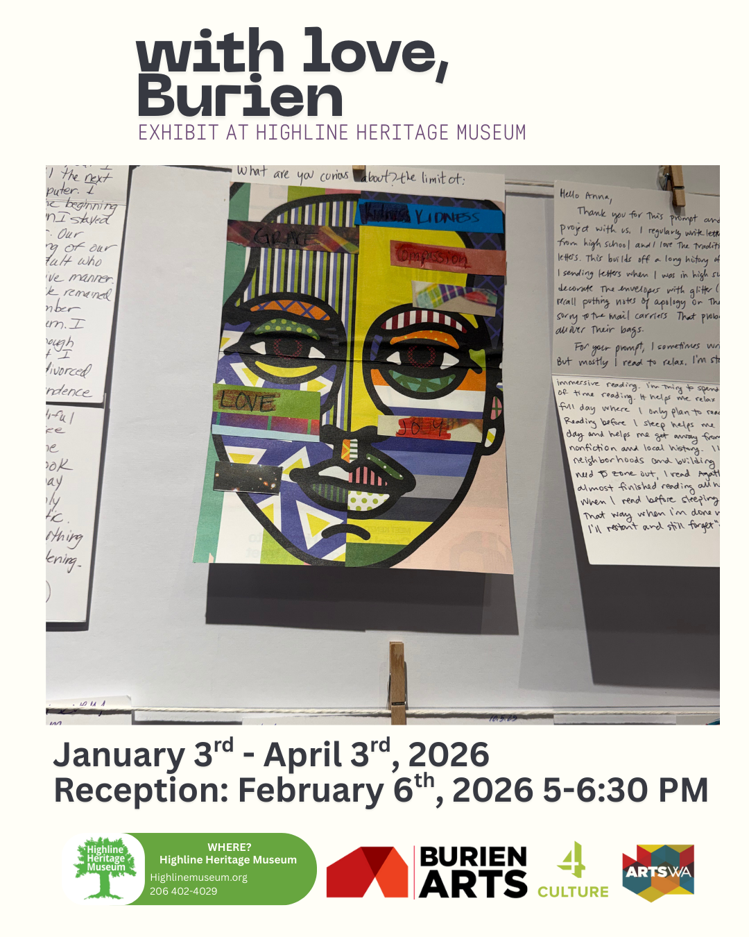 Celebrate the collective creativity of Burien and beyond. Individual letters, sent between September and December 2025, make up the bright threads of our community story. Experience—and contribute to—its warm, human heart.